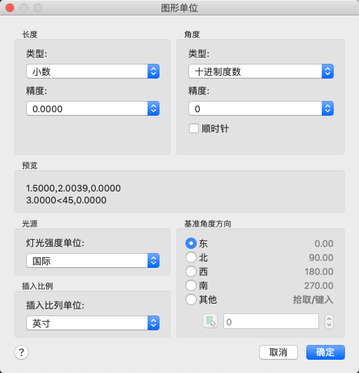 设置零角度的方向。下列选项会影响角度、显示格式、极坐标、柱坐标和球坐标等条目。