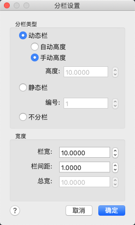 显示用于设置栏的选项,例如类型、栏数、高度、宽度及栏间距大小。