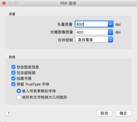 - 将 TrueType 字体嵌入在 PDF 文件中,这样便不需要在 PDF 查看器上提供它们。如果不选择此选项,PDF 查看器将使用替代字体。