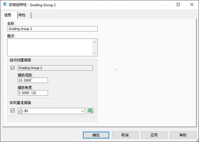 若要固定圆弧三角剖分,需要为放坡组中的镶嵌间距设定一个更适合的值。如图 26 中所示,由于它仅能在启用“自动曲面创建”时进行设定,所以很难在“放坡组特性”对话框中找到它。但是该设定也用于“创建拆离的曲面”命令和填充放坡三角剖分。此点的最佳解决方案是打开“自动曲面创建”,将镶嵌间距从默认值 10 英尺更改为 1 英尺,然后再关闭“自动曲面创建”。若要应用更改的设定,必须在打开“自动曲面创建”后单击“应用”。