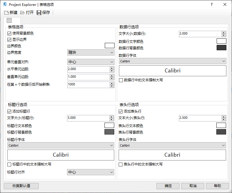 “表格选项”可确定从 Project Explorer 生成的所有 AutoCAD 表格的边框颜色、字体大小和类型、单元边距以及常规视觉样式。