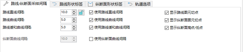 为直线、缓和曲线和曲线图元上的路线设置桩号采样间隔。(可选)特定图元类型的间隔可以禁用,这在仅需要缓和曲线或曲线上的间隔点时非常有用。若要对所有图元类型使用公共路线间隔,请使用“锁定桩号间隔”复选按钮。