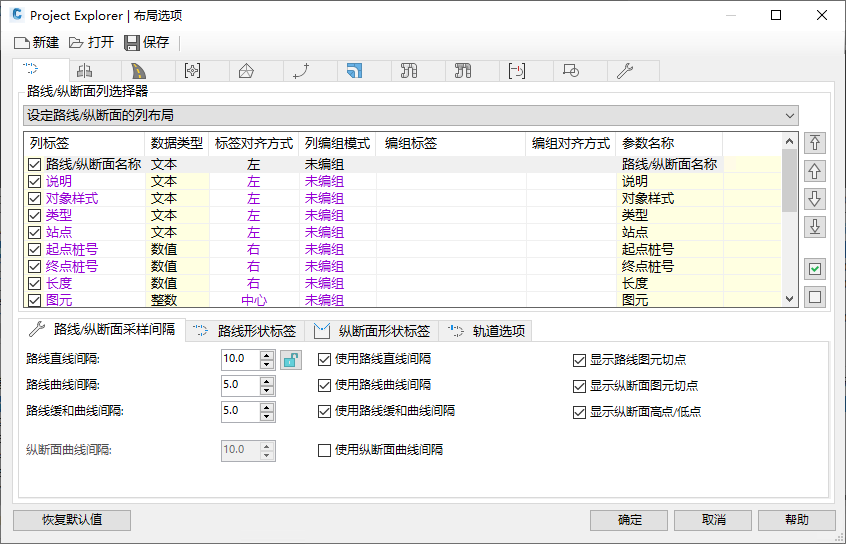 除了标准列布局和标签选项外,“布局选项”窗口中的“路线”选项卡还提供了一系列专用选项,用于控制与路线和纵断面相关的桩号和图元数据的显示和格式。