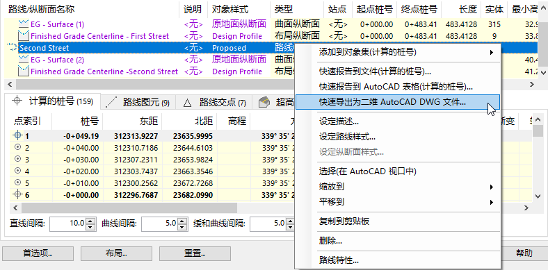 结果是 DWG 文件,该文件可以在支持 AutoCAD DWG 文件格式的任何应用程序中打开。导出的文件应具有尽可能小的文件大小。从 Project Explorer 导出的 DWG 文件为制作二维图形奠定了理想基础,尤其是当使用对象集来有效地使导出的文件与源 Civil 3D 图形保持同步时。
