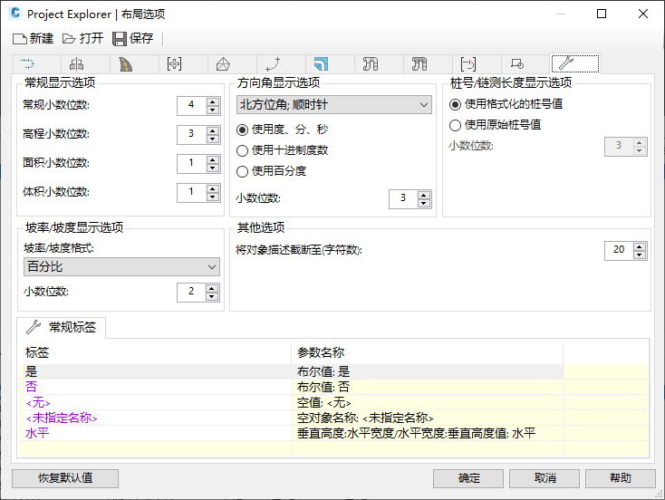 允许为高程、坡度/坡率、面积、体积和其他数值指定小数位数。