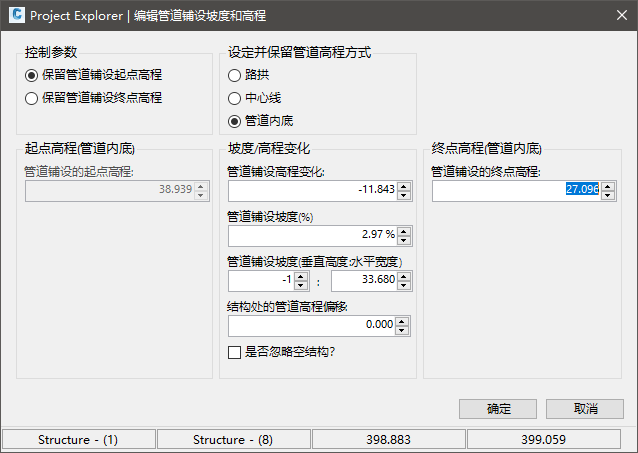 可以在保持选定管道铺设起点或终点的高程的同时,应用新的管道坡度值,如果在当前管道铺设中对管道直径进行任何更改,可以选择在与每个结构交叉时保留管道的管道内底、路拱或中心线高程。管道坡度可以用百分比或水平宽度:垂直高度表示,并且在与管道铺设中的每个结构交叉时,可以选择应用高程偏移。