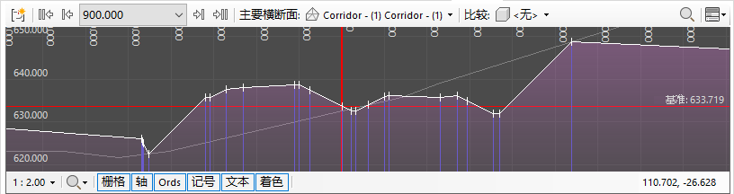 道路横断面图 - 在任意基准线桩号处查看通过道路的动态横断面,并轻松识别特定的连接、点、造型代码以及各个部件。将偏移和高程值与设计中的其他元素(例如原地面曲面)进行对照。