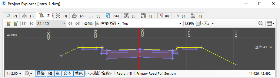 “道路”选项卡中的道路视图可显示在桩号或链测长度位置范围内穿过选定道路的动态横断面。使用道路中可用桩号的向前/向后箭头或下拉列表,以选择要在其位置显示横断面的桩号。然后,可使用工具栏中的“查找”选项在道路视图上亮显特定点、连接或造型代码。可以从下拉列表中选择代码,或者针对需要亮显多个代码的情况,可采用逗号分隔列表的形式将代码键入字段中。