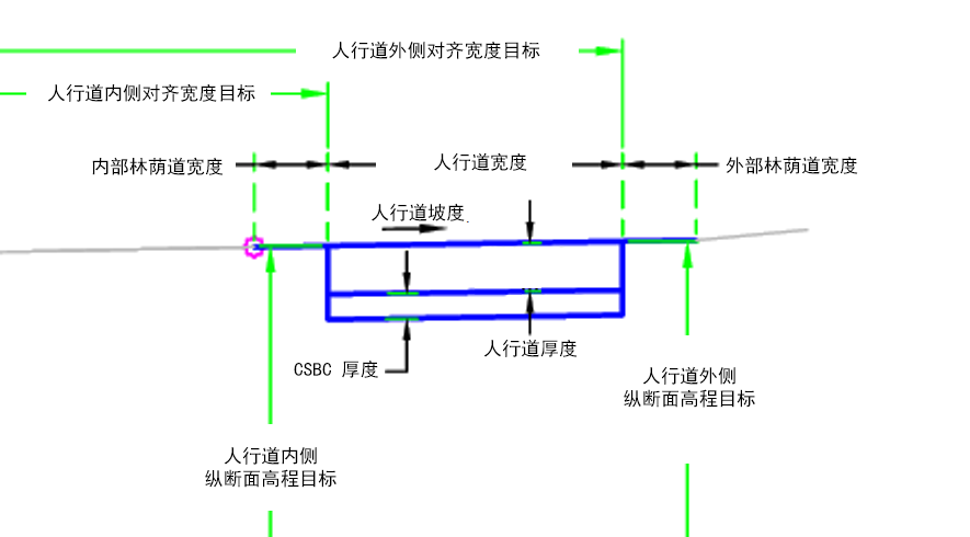 将从附着点沿给定的坡度向外插入内部草地带、人行道和外部草地林荫道连接。通过指定零宽度可以忽略草地带。 如果将参数设置为包含该宽度,则 CSBC 构造在人行道下方。