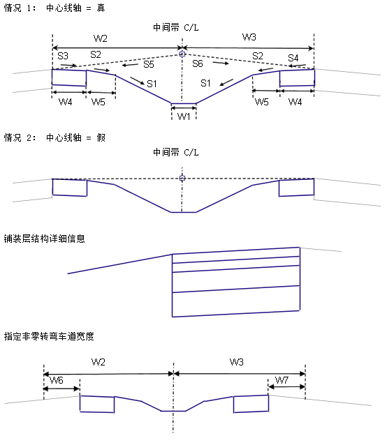 在布局模式中,此部件将基于给定的输入参数,并假设车道坡度为 -2%、铺装路肩坡度为 -5%,从而计算并显示中间带和路肩。