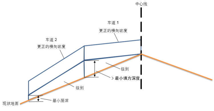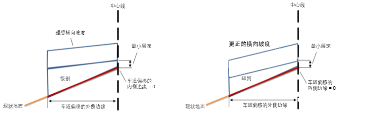 将计算并应用更正的横向坡度,但不会应用高程调整或摆动。在某些情况下,可能无法满足最小填方深度。
