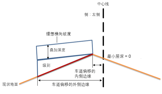 现有车道的内侧边缘 这是计算原地面坡度的起点。 数值 0.000 米(0.000 英尺)