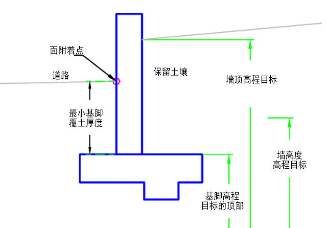 面高程 当附着点为后面时,可用于控制墙面的高程点。以下对象类型可用作用于指定高程的目标:纵断面、三维多段线、要素线或测量地物。 可选