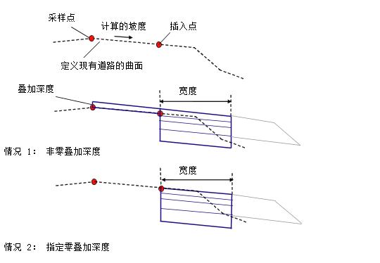 将确定“现有曲面”上的“采样点”和“插入点”的高程,并计算出从采样点到插入点的坡度。在现有车道上方沿同一坡度添加一个给定“叠加深度”的叠加层。将通过在现有坡面上叠合一个或多个连接,创建一个闭合叠加造型。将使用计算出的坡度,从“插入偏移”处的叠加向外附着加宽车道。