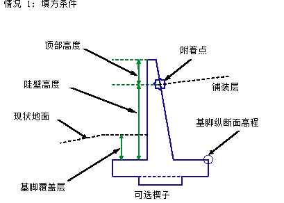 陡壁高度由从基脚顶部到垂直面上地面高程的插入点之间的距离来确定,无论哪个点处于较高的位置。陡壁倾斜边坡、基脚宽度、陡壁垂直面的偏移、可选楔子标注及键中心点的位置都是陡壁高度的函数。