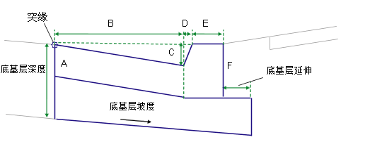 将基于输入参数“标注 A”到“标注 F”的值插入路缘和边沟连接。所有标注都必须为非零的正值。如果给定非零的“底基层深度”,那么底基层将被插入到路缘后部,并延伸至“底基层延伸”宽度。底基层接近于路缘后部的底部,如图所示。