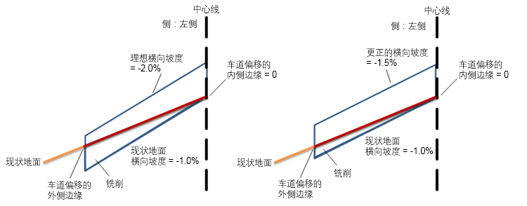 外侧或内侧车道超高将替换理想横向坡度。铺装层的更正的横向坡度值将由横断面的超高表定义,而不是由理想横向坡度定义。