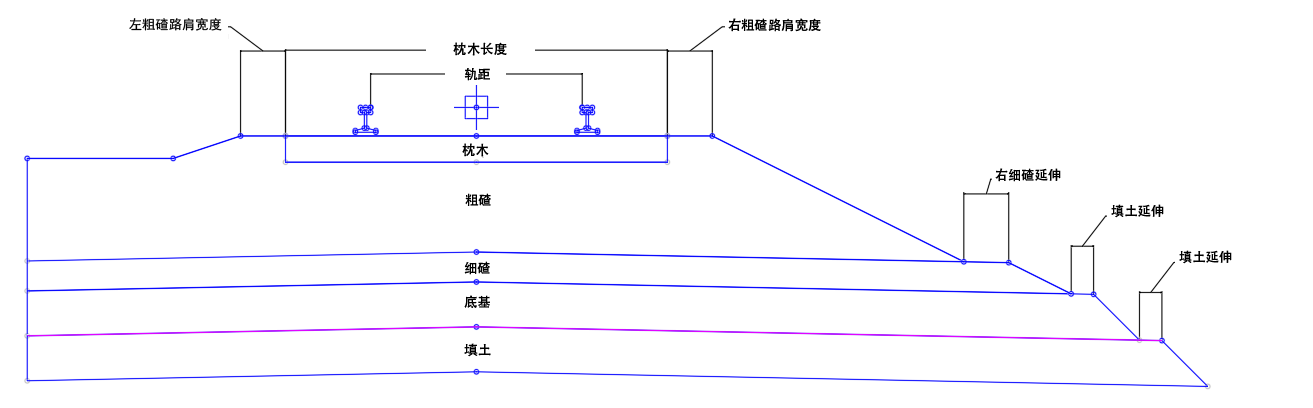 | 粗碴边坡(左侧和右侧) | 粗碴材质侧的坡度。粗碴材质顶部的坡度应与铁路超高造成的枕木坡度相一致。 | 坡度(非负数) | 2:1 |