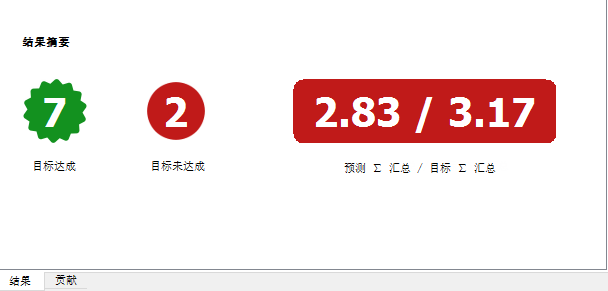 在“公差分析”面板的底部是“结果”窗格。当存在多个叠加,但未选择任何叠加时,“结果”窗格会显示满足或不满足的目标数量摘要,以及使用“设置”中指定的首选质量指标的质量汇总。