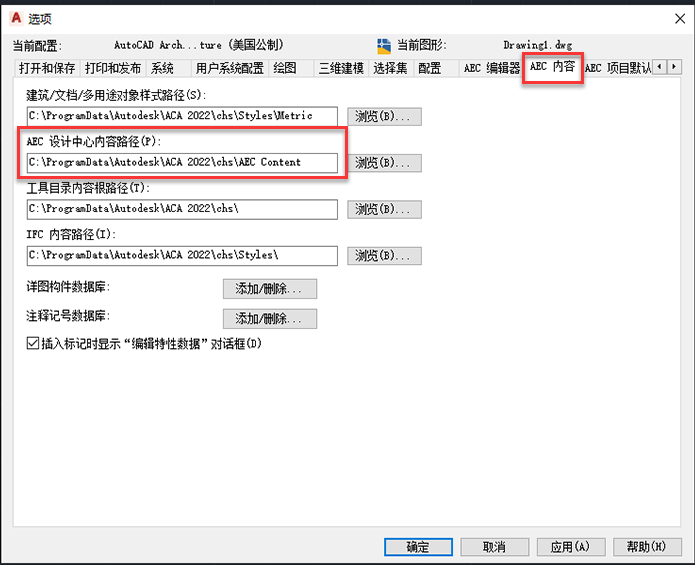 要查找内容包文件,请在命令行中输入 OPTIONS。在“选项”对话框中,单击“AEC 内容”选项卡。