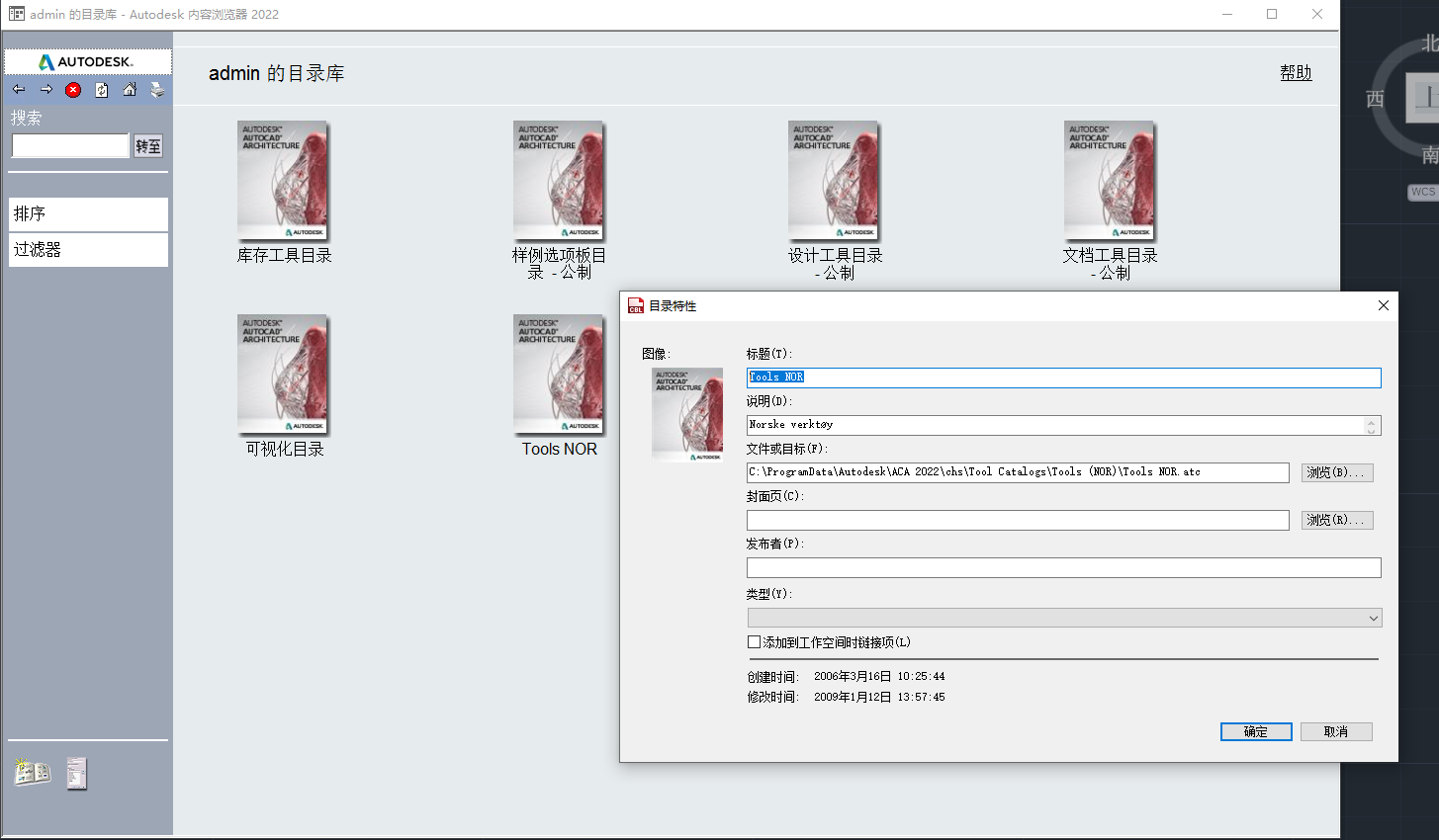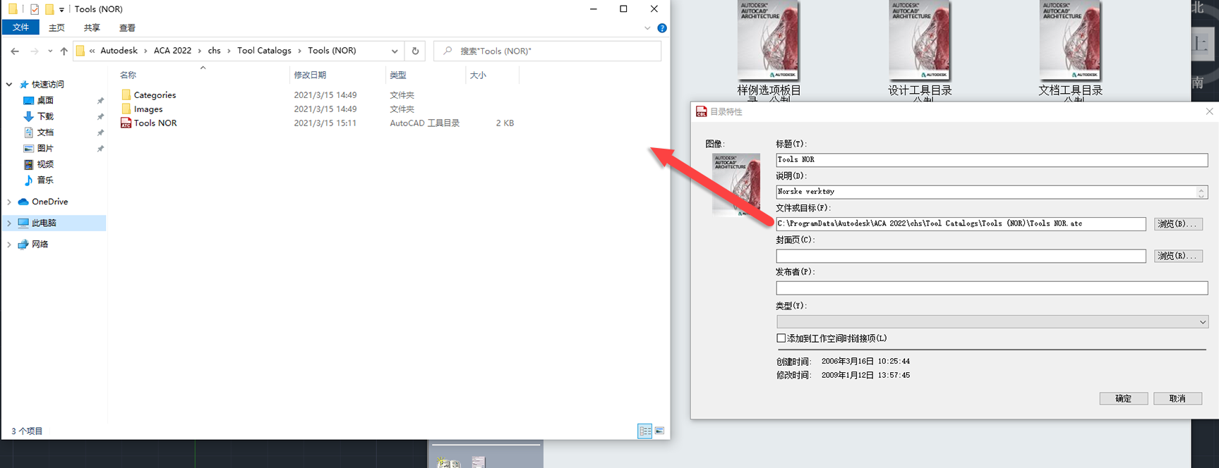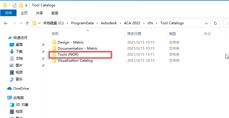 转到其相关工具和文件所在的目录位置。默认情况下,所有工具目录都放置在 C:\ProgramData\Autodesk\ACA 2022\chs\Tool Catalogs 目录下。