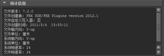 通过“统计信息”(Statistics)窗口,您可以查看有关传入 (FBX) 文件和系统(应用程序)设置的相关 Meta 信息。具体信息会因文件内容的不同而有所差异。例如,您可以使用“统计信息”部分确定创建文件的时间、上方向轴朝向的方向、使用的文件单位和帧速率。