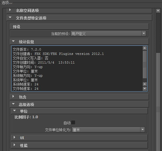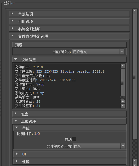 注: 请确认 Maya 场景所用的“系统单位”(System Units),以便控制 Maya FBX 插件是否需要缩放场景。
