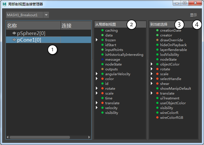 | 2 - 从局部剖视图(From Breakout) | 显示 MASH 网络的属性。在此处选择一个属性,然后在“到当前选择”(To Selection)区域中选择另一个属性,以创建新连接。 |