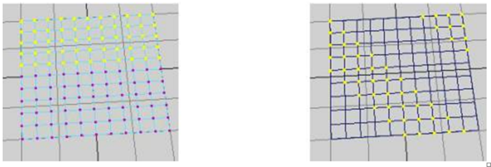 For example, consider that you have created a 10 x 10 polyPlane with history. You have selected the upper vertices in the plane, and then created a cluster. The cluster acts on the selected vertices, which are contained in its set. Now, you select the history node for the plane and modify the plane's number of divisions from 10 x 10 to 9 x 10. The membership of the cluster is now different than what you had originally specified. The following figure illustrates this example. The membership of the cluster that is created on a 10 x 10 plane is shown on the left and after the history is modified to 9 x 10 is shown on the right.