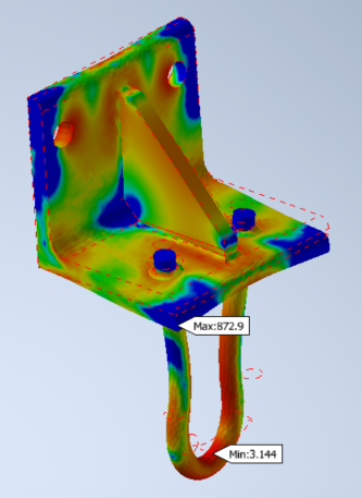 Tip: The actual maximum safety factor is many times greater than the minimum value, which skews the contour color towards red for most of the model. Reducing