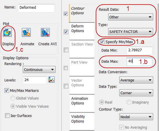 Data Max reduces the range of the plot legend and eliminates the skewed contour problem. Resolution is lost at the higher safety factor values, which appear as dark blue (in this case, values over 40). This is inconsequential, since the low safety factor values are the ones of interest.