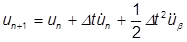 At any time n, we know the displacement, velocity and acceleration. Using this information, there are a number of ways to find the displacement, velocity and acceleration at a subsequent step. For example, if we assume the current velocity remains constant until the next time increment, the subsequent displacement