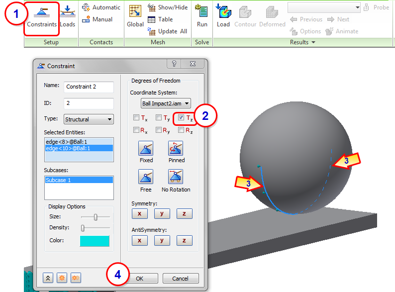 This constraint ensures the ball does not bounce sideways as a result of element face angles. Although not required for the analysis, it ensures that we get the response in the expected direction.