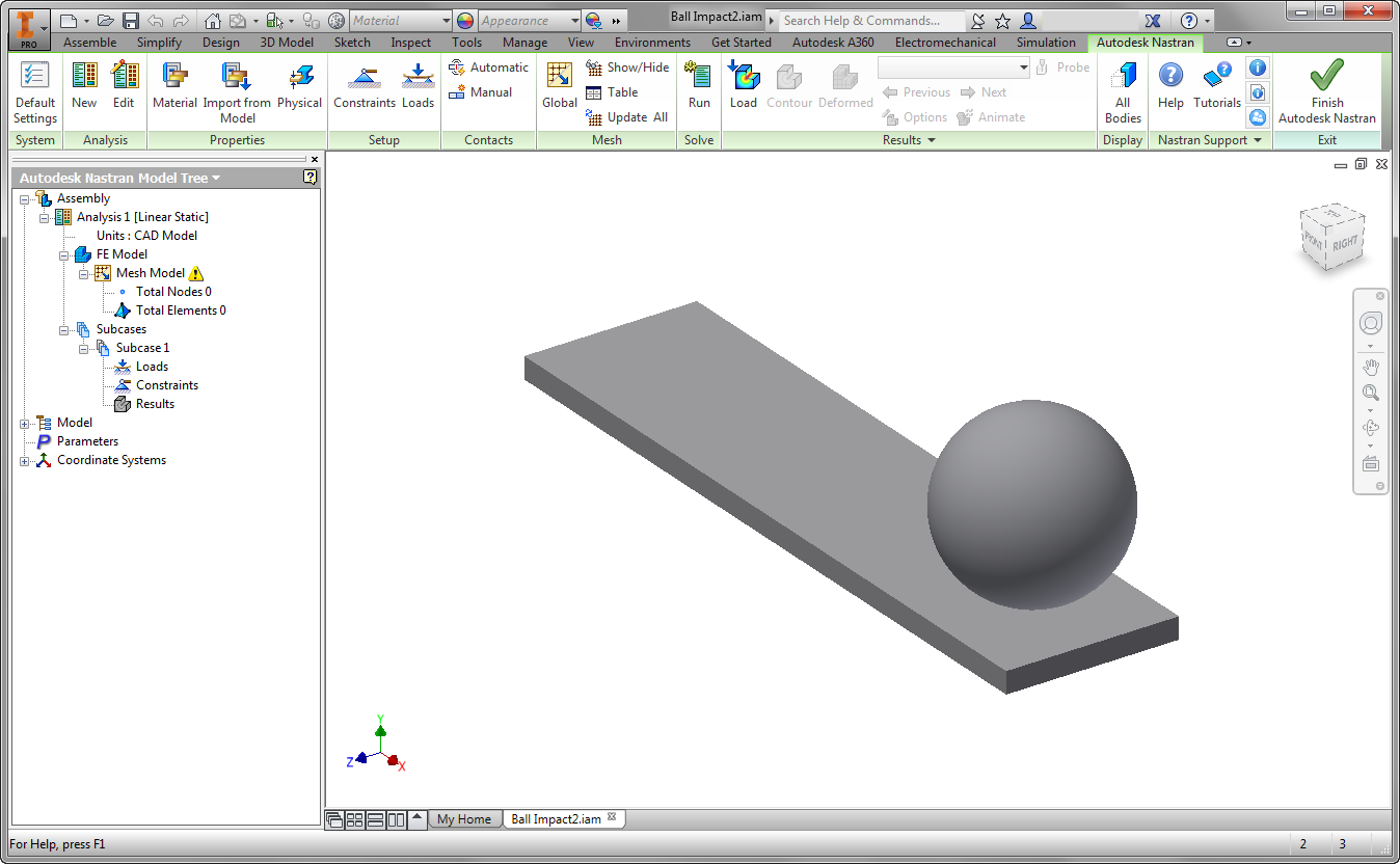 In this exercise, we will simulate a ball dropping from 12 inches onto a steel plate and rebounding back up into the air. This is an example of a nonlinear transient analysis. It requires both dynamic and nonlinear setup steps.