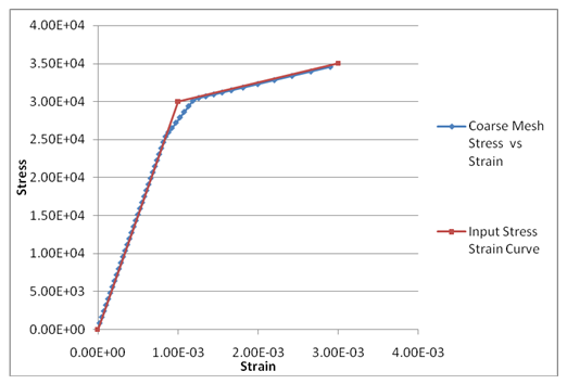 The two images below show the stress-strain curves for two different mesh density. You can see how a finer mesh follows the input stress-strain curve more accurately.