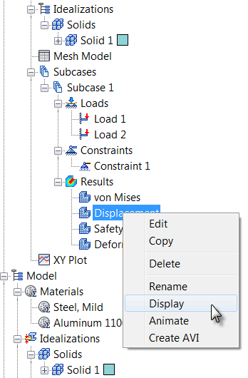 In the Model tree, expand the Idealizations node to check for any existing definitions, such as Solid 1. If any exist, right-click . Doing this ensures that you won't have unwanted materials appearing in the part mesh and the analysis.