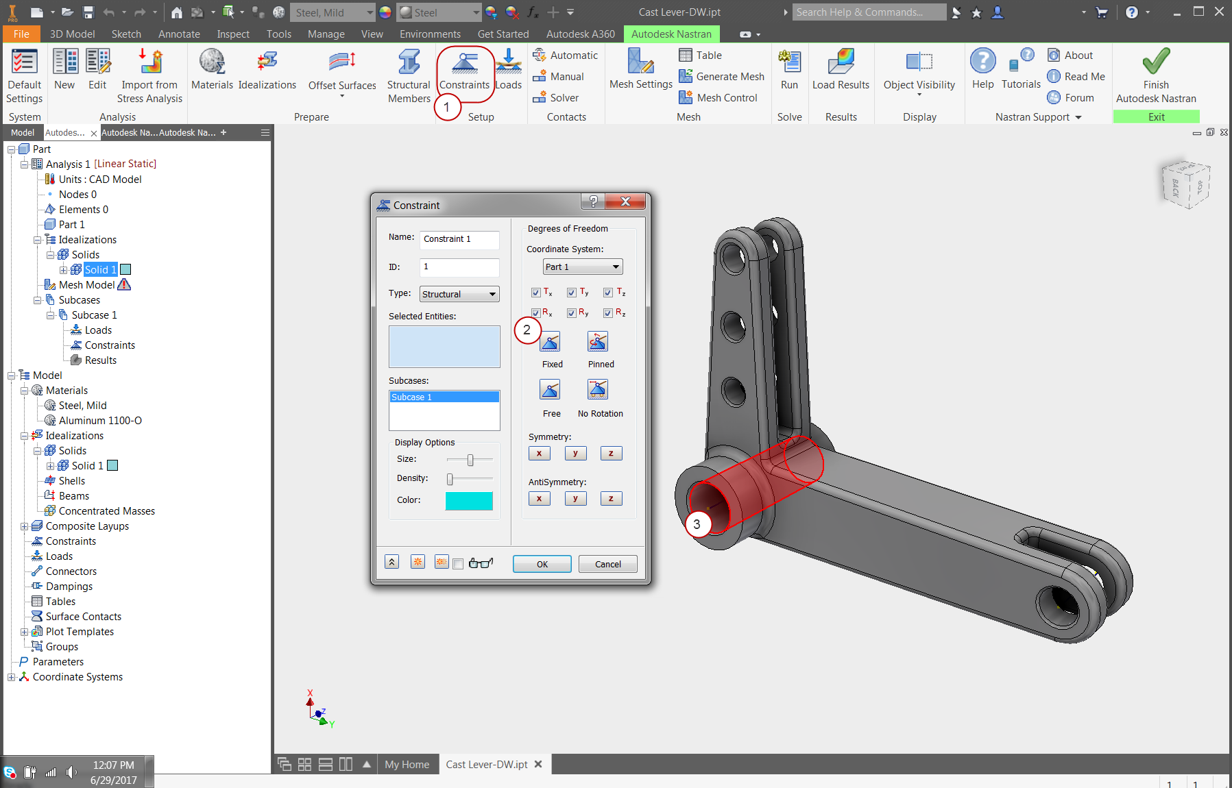In this exercise we computed the engineering values needed to properly load and constrain the cast lever. The steps we used were similar to those used in the first exercise (cantilever beam), but the model was a real-world part. We also learned how to extract results including the use of the Probe tool.