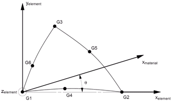 壳单元的 X 方向如以上图像所示。请注意,在进行自动网格化时,可在网格内随意定义 G1 和 G2 栅格点(用于定义单元 X 方向),因此需要定义材料的 X 方向以对齐单元输出。可由节点排列来确定单元 Z 轴。这可以是顺时针或逆时针方向。对于线性三角形壳体,则通过右手定则由 G1-G2-G3 确定单元的 Z 方向。可由单元的 Z 轴和 X 轴计算出单元的 Y 轴。