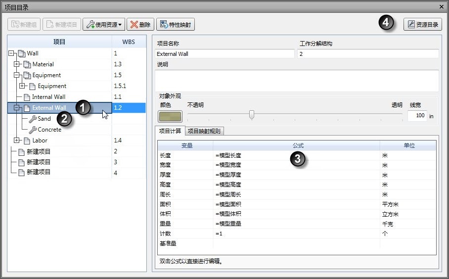 “项目目录”是用于算量的组织数据库。“项目目录”和“资源目录”共享相同的结构、选择树、变量窗格和常规信息。“项目目录”中的项目可以直接与模型对象(如墙或窗)相关联。项目可以单独存在,也可以包含资源。