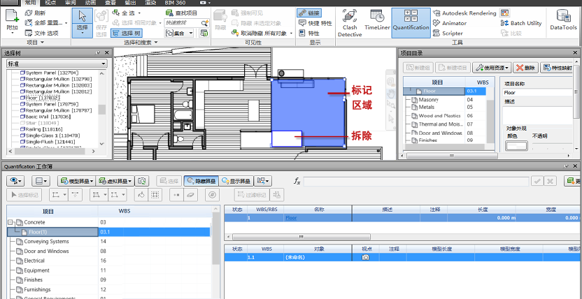 使用去除功能可剪切掉几何图形的一些部分。通过绘制去除,可以排除现有区域算量。例如,当已标记要进行算量的地板,但是想要从算量中排除该区域的一部分(如走廊)时,去除将非常有用。将从 Quantification 工作簿的楼层面积中“去除”走廊拆除面积。