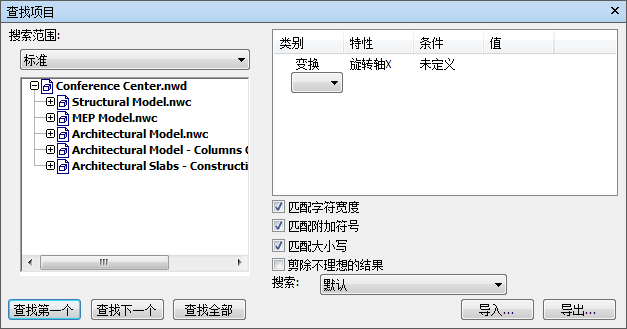 每个类别和特性名称都包含两个部分 - 用户字符串(显示在 Autodesk Navisworks 界面中)和内部字符串(不显示,主要由 API 使用)。默认情况下,按这两部分匹配项目,但是如果需要,可以指示 Autodesk Navisworks 仅按一部分匹配项目。例如,可以在搜索中忽略用户名,而仅按内部名称匹配项目。这在计划与可能正在运行 Autodesk Navisworks 本地化版本的其他用户共享已保存的搜索时,会非常有用。