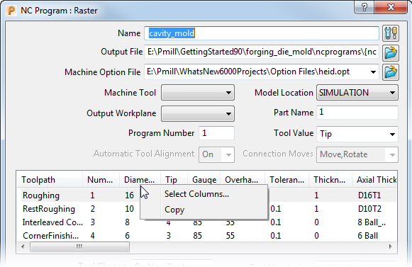 可使用“选择列”对话框自定义列视图。这使您可以控制在“NC 程序”和“刀具数据库”对话框中显示的信息量,以及指定它们的优先次序。