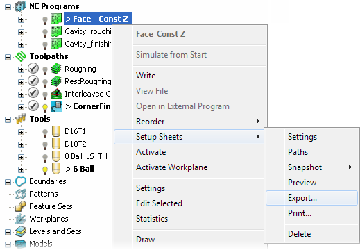 从单独的 NC 程序关联菜单中选择“设置清单”>“输出”。