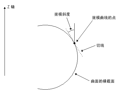 拔模曲线的点沿曲面确定。这些点被视为曲面上切线与垂直于主平面的轴形成拔模角的位置,如下所示: