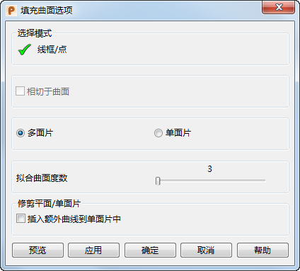 要在使用“填充”选项创建曲面时指定高级创建选项,请单击“智能曲面”对话框中的“高级”,以显示“填充曲面选项”对话框。