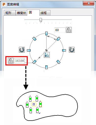 设置图案半径 - 将图案半径指定为原点与原始对象之间的距离。您无法输入其它值。单击 可交换模式并输入半径。