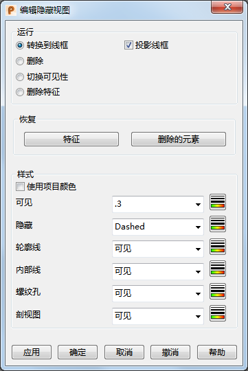 “样式”区域中的选项设置可见线和隐藏线的样式: