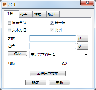 之后 - 输入要显示在尺寸值后面的任何文本。选择相邻列表中的条目可向文本方框中增加符号。