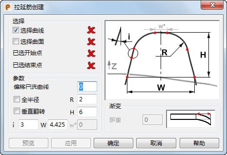 参数 - 此部分中的选项用于通过调整参数来更改拉延筋曲面的形状和尺寸: