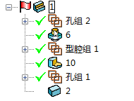 孔将划分到两个不同的“孔组”特征,型腔特征划分到“型腔组”。每个特征组都标有